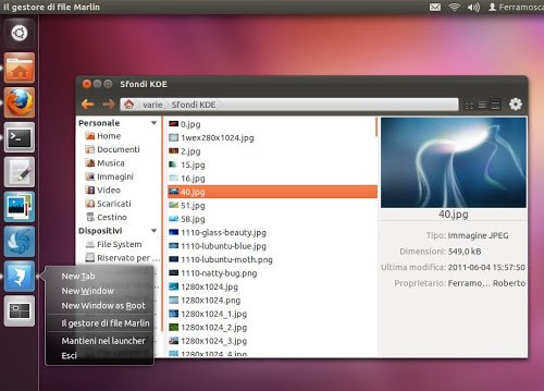 La versione in fase di sviluppo di Marlin aggiunge il supporto per il nuovo ambiente desktop Unity portando un’utile QuickList con la quale ci permette di avviare una nuova scheda (Tab) oppure avviare una nuova finestra da utente “normale” o da amministratore (Root). Inoltre come per Nautilus il nuovo Marlin aggiunge nel collegamento su Unity la barra dei progressi che ci indica lo stato di una copia o spostamento di uno o più file, inoltre ci permette di annullare l’operazione in corso.