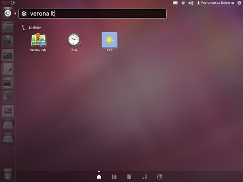 Una volta installato Ubuntu Cities Scope basta avviare il Dash e nella barra di ricerca inserire il nome della località sulla quale vogliamo conoscere le condizioni meteo accompagnate dalla nazionalità per esempio verona it. Appena inserita la località ci apparirà sotto la barra di ricerca la località corretta, l’ora attuale e la temperatura con un’icona che ci indica la condizione meteo in tempo reale.