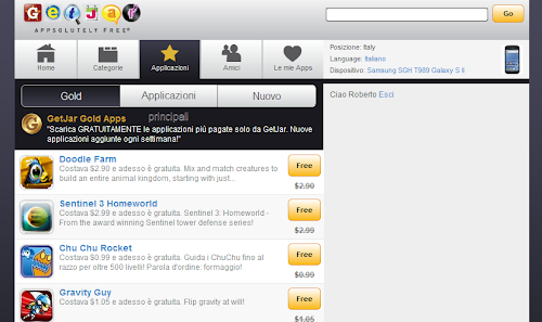 Utilizzare GetJar è molto semplice basta collegarci al sito dal nostro dispositivo digitando dal browser m.getjar.com e installiamo l’applicazione. Una volta installata e avviata l’applicazione basta andare nella sezione Gold dove troveremo le applicazioni a pagamento in modalità free, purtroppo molte di queste sono accessibili per un tempo limitato e quindi è consigliabile installare immediatamente l’applicazione appena la vediamo in modalità gratuita.