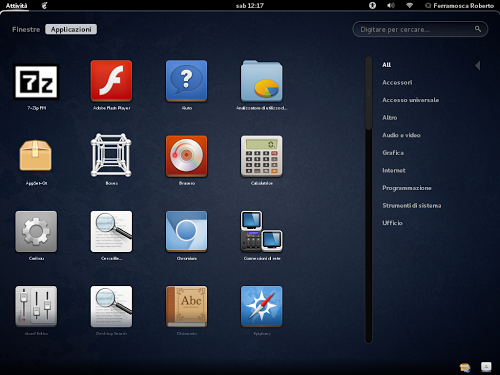 Attraverso la sezione Applicazioni possiamo avere la lista di tutte le applicazioni installate nella nostra Distribuzione e sulla sinistra possiamo selezionare una categoria di applicazioni per facilitarci la ricerca. Su questa sezione riaveremo anche il Dash il quale risulta molto scomodo dato che se avviamo un monitor di dimensioni ridotte ci porta via spazio a disposizione della ricerca.