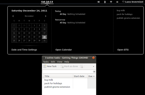 Attraverso l’estensione per GTG su Gnome Shell potremo quindi consultare le attività che stanno per scadere direttamente dall’applet ora e calendario, basta un click sull’oggetto per visualizzare interamente l’appuntamento. Inoltre possiamo avviare direttamente Getting Things GNOME! cliccando su OpenGTG.
