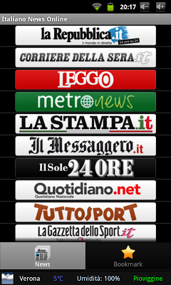 Italiano News Online ci permette di consultare le news suddivise per carie categorie e di leggere l’intero articolo direttamente dall’applicazione ottimizzando la pagina per la lettura senza sprecare mb di traffico in pubblicità ecc. L’applicazione supporta moltissimi siti e permette molte funzionalità tra queste la possibilità di personalizzarne i colori, le animazioni, la visualizzazione di immagini e l’aggiunta di segnalibri personali.