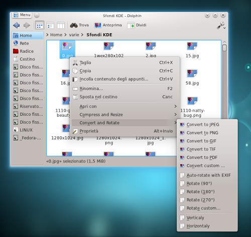 Inoltre il Service Menu USU aggiunge la possibilità di avviare una cartella da root (usare questa funzionalità con molta attenzione) utile per esempio se vogliamo copiare, spostare o modificare qualche file all’interno del nostro sistema). Molto utili le varie funzionalità proposte per le immagini, difatti con il nuovo Service Menu potremo ridimensionare, comprimere, convertire o ruotare le nostre immagini direttamente da Dolphin senza quindi utilizzare alcuna applicazione.