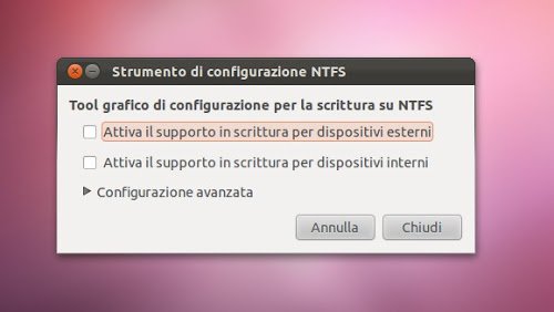 Possiamo gestire i nostri dischi i partizioni ntfs attraverso una semplice applicazione denominata ntfs-config la quale grazie ad una semplice interfaccia grafica permette di montare o smontare le partizioni con ntfs.