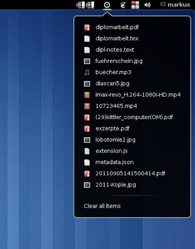 Recent Items è una nuova estensione per Gnome Shell la quale attraverso un semplice collegamento nel nostro pannello possiamo avere una lista degli ultimi file avviati. Grazie a Recent Items potremo anche cancellare la cronologia dei nostri file e mantenere cosi la nostra privacy semplicemente cliccando su Clear all items.