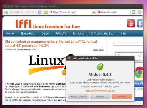 Novità in casa Midori il famoso Browser basato su WebKitGtk e di recente aggiornato alla nuova versione 0.4.3 la quale oltre alla correzione di alcuni problemi che portano una maggiore stabilità al Browser aggiunge alcune interessanti novità.