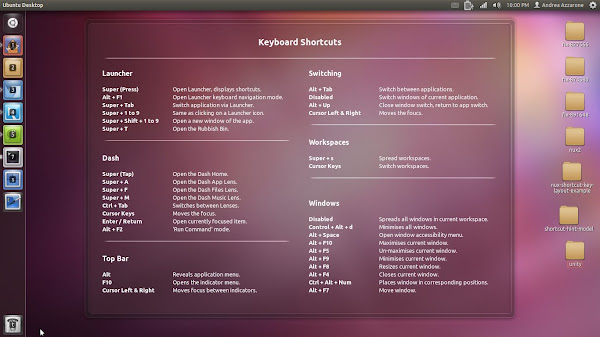 Dalla prossima Ubuntu 12.04 Precise LTS potremo quindi avere una schermata con indicate tutte le principali scorciatoie da tastiera. Un’ottima funzionalità che ci permetterà quindi sia di conoscere e imparare a velocizzare alcune operazioni attraverso le scorciatoie da tastiera.