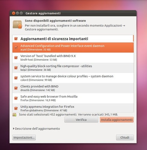 Il gestore degli aggiornamenti di Ubuntu denominato anche Update Manager di default controlla automaticamente ogni giorno la presenza di nuovi aggiornamenti e in caso di aggiornamenti di sicurezza avvia automaticamente la finestra indicandoci di effettuare l’aggiornamento.