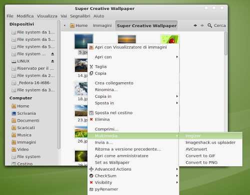 Difatti con Nautilus Actions Extra possiamo avere la possibilità di ridimensionare un’immagine, convertirla in un’altro formato, ruotarla e rinominarla direttamente da Nautilus semplicemente selezionandola e dal menu contestuale andare in Multimedia -> Imgizor.
