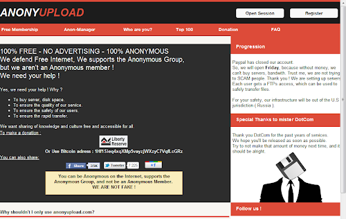 Anonyupload è un servizio completamente gratuito e completamente anonimo il quale permette a qualsiasi utente di avere a disposizione un illimitato spazio web per caricare e condividere file con chi vuole il tutto gratuitamente e senza alcuna pubblicità. Tutto il sistema viene sostenuto tramite donazioni inoltre tutti i server sono localizzati in Russia quindi impedendo da leggi americane di sequestrare o attivare leggi per bloccare il servizio.