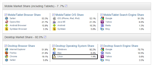 Secondo NetMarketShare l’1.4% degli utenti usa un sistema operativo Linux, percentuale ancora molto bassa visto il 92% degli utenti Windows e i 6.4% di Mac. Comunque in questo anno Linux è molto cresciuto secondo NetMarketShare dato che solo a febbraio 2011 gli utenti erano solo il 0.9%.