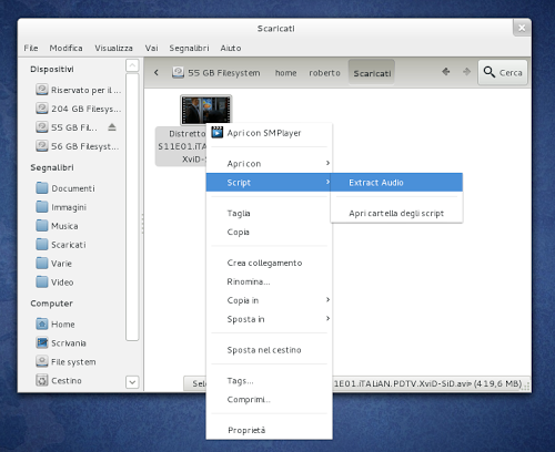 a questo punto scarichiamo lo script da questa pagina estraiamolo e copiamo il file Extract Audio sulla cartella .gnome2/nautilus-scripts/ presente nella nostra Home (di default è nascosta per visualizzarla basta cliccare su Ctrl+h).