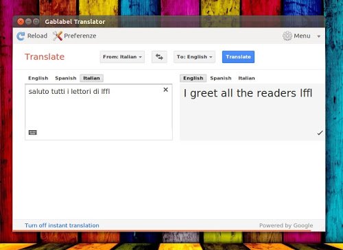 Gablabel è un nuova applicazione la quale ci permette di utilizzare Google Traslate da una semplice finestra senza dover quindi avviare il nostro Browser. L’interfaccia di Google Traslate rimane quindi invariata offrendoci quindi le stesse funzionalità che avremo nel nostro Browser. Inoltre Gablabel aggiunge anche alcune funzionalità come ad esempio la possibilità di tradurre il testo copiato (clipboard) anche attraverso scorciatoie da tastiera.