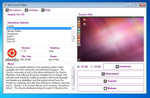 Get Linux è una semplice applicazione per Microsoft Windows che permette di conoscere e scaricare oltre 100 delle più famose e utilizzate Distribuzioni Linux. Permette di conoscerne i dettagli, collegarsi alla pagina dedicata di DistroWatch e di vederne anche un video su YouTube collegarsi alla home della Distribuzione e di scaricare l’ISO il tutto da una semplice interfaccia.