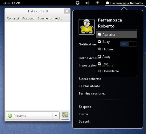 Gnome Shell di default permette di gestire il nostro stato direttamente dallo Status Menu pultroppo supporta solo alcune applicazioni e non Pidgin. Possiamo comunque integrare lo stato di Pidgin su Gnome Shell tramite una semplice estensione dedicata denominata Pidgin Integration.