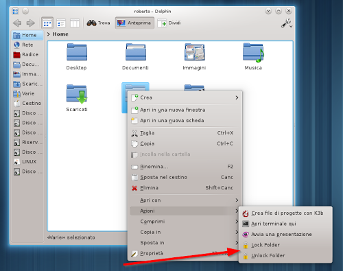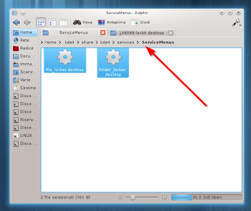 Installare Lock It (File Locker/Unlocker) nella nostra Distribuzione è molto semplice basta scaricare il service menu da questa pagina estrarlo e copiare i 2 file file_locker.desktop e folder_locker.desktop nella cartella ~/.kde4/share/kde4/services/ServiceMenus/ presente nella nostra Home (per visualizzare le cartelle nascoste basta premere F8 se la cartella ServiceMenus non c’è basta crearla).