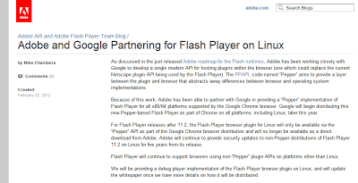 Adobe in queste ora ha annunciato che rimuoverà Flash Player per Linux e lo renderà disponibile solo per Google Chrome. L’annuncio (che farà sicuramente molto discutere) arriva dopo l’intesa con Google nel rilasciare un plugin dedicato a Crome (disponibile sia per 32 che 64 bit) attraverso Pepper Plugin API (PPAPI) con il quale potranno beneficiarne anche altri browser. Nelle prossime ore quindi Flash Player per Linux sarà rimosso dai repository ufficiali di Adobe mentre rimarrà invariato per Windows e Mac.