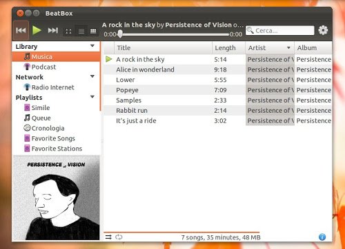 Beatbox 0.3 “Acolyte” corregge alcuni bug e migliora l’interfaccia utente portando nuove visualizzazioni come la vista per album e un migliore importazione delle cover. Migliorata anche la velocità d’avvio del player e la performance nel suo utilizzo, inoltre troviamo il supporto completo per i podcast e le radio in streaming. Il nuovo Beatbox 0.3 permette anche di sincronizzare i brani da iPod grazie alla libreria libgpod, aggiunta anche la possibilità di importare ed esportare playlist. Migliorata anche la gestione dei tag e la visualizzazione del testo del brano in riproduzione grazie al servizio offerto da Liric. In questa pagina troverete le note di rilascio del nuovo Beatbox 0.3.