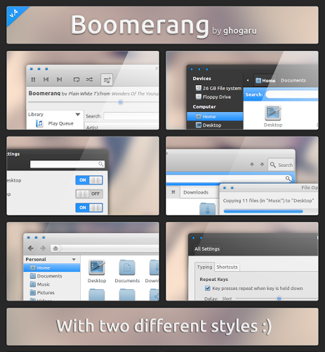Boomerang è un tema per Gnome rilasciato in 2 varianti una grigia e una nera (Boomerang Deux) con colore preferito blu, particolari i pulsanti della finestra circolari di dimensioni molto piccole e di color blu che offrono un’ottima integrazione con il tema.