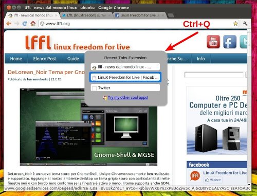 Recent Tabs è un’utile estensione per Google Chrome con la quale possiamo attraverso una semplice combinazione di tasti (Ctrl+Q) l’avvio di una finestra con presente tutti i tab attivi. Molto utile quando abbiamo molte schede avviate ci permette di velocizzarne il passaggio da una all’altra.