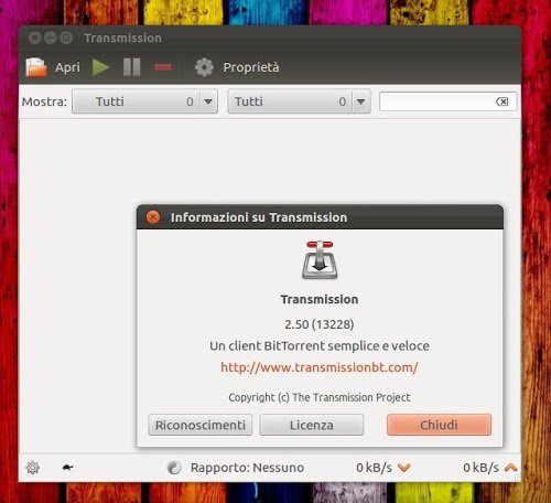 Transmission 2.50 è già presente su Ubuntu 12.04 mentre se vogliamo installarlo su Ubuntu 11.10 e 11.04 potremo farlo utilizzando i PPA Transmission Stable (in data odierna non ancora aggiornati) per farlo basta digitare da terminale: