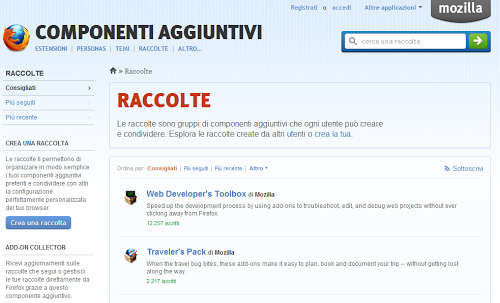 Presenti ormai dal 2009 le raccolte di add-on per Firefox permettono a qualsiasi utente di creare una propria collezione di componenti aggiuntivi preferiti e condividerli con i nostri amici attraverso il sito Web di Mozilla.