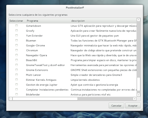 PostInstallerF è un nuovo tool scritto in Zenity con il quale possiamo installare i migliori programmi in modo semplice ed intuitivo su Fedora. Attraverso PostInstallerF installeremo automaticamente i repository rpmfusion,pacchetti non presenti su repository ufficiali come ad esempio driver proprietari, applicazioni per la conversione video ed editing, la navigazione internet, ecc. Tra le principali caratteristiche di PostInstallerF troviamo anche la possibilità di aggiungere le principali estensioni di Gnome Shell e strumenti per creare lanciatori applicazioni come Hyper Converter, MobilMedia Converter ecc.