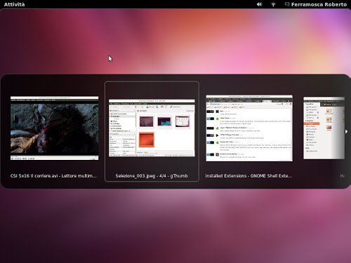 Gnome Shell come per il resto degli altri ambienti desktop per Linux permette di passare da una finestra all’altra attraverso lo switcher il quale grazie alla combinazioni di tasti Alt+Tab ci permette di avere una finestra al centro del nostro desktop con presente un’icone per ogni specifica per ogni finesta avviata. Basta scegliere quale utilizzare per avviare la finestra correlata, possiamo inoltre visualizzarne le anteprima cliccando sulla freccia in basso. Per facilitarci la scelta e visualizzazione della finestra da avviare sarebbe più comodo averne subito l’anteprima funzionalità che possiamo avere grazie ad una semplice estensione.