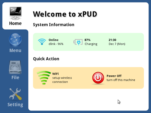 Basata su di un’interfaccia dedicata all’utilizzo sopratutto su pendrive o netbook, xPUD ci permette una facile gestione della distribuzione grazie alle varie sezioni dedicate. Non è presente alcun gestore delle finestre, il tutto per rendere ancora più veloce la distribuzione, difatti l’interfaccia è basata su Gecko il motore di rendering presente in Mozilla Firefox, questa scelta permette di avere un’ottima velocità, una buona impostazione grafica, oltre che il supporto alle tecnologie più importanti quali tutti i linguaggi per il Web, il supporto a SVG, MathML e JavaScript. Inoltre xPUD porta con sé il tool mkxpud,il quale permette di gestire con i binari in modo da rendere più facile e veloce l’installazione.