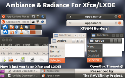 Il team RAVEfinity ha recentemente annunciato l’arrivo della versione per XFCE ed LXDE/Openbox dei temi Ambiance e Radiance, che permettono quindi di installare il tema di default di Ubuntu anche su Xubuntu e Lubuntu.