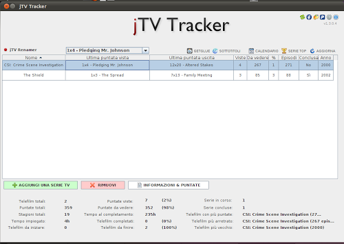 jTV Tracker è una fantastica applicazione la quale ci permette di essere informati sulle serie TV preferite, avere informazioni sulle nuove puntate e molte altre utilissime funzionalità. Possiamo gestire le nostre serie TV, scaricarle rinominandole correttamente oppure scaricarne i sottotitoli, consultare le locandine, l’elenco puntate con la trama per ogni episodio, curiosità ed aneddoti, immagini da scaricare, e tanto, tanto altro (i dati sugli show vengono automaticamente aggiornati da TVRage e TheTVDB).