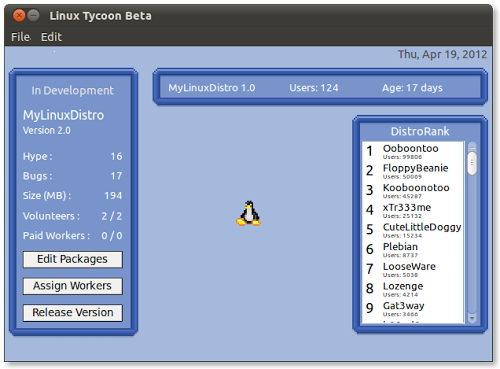 Linux Tycoon è un gioco con il quale dovremo creare una nostra distribuzione e renderla famosa. Per farlo dovremo superare non pochi ostacoli (che esistono anche nella realtà): ossia impostare il gestore dei pacchetti, ambiente desktop, correggerne i bug, gestirne gli sviluppatori e la comunità in modo che la nostra distro cresca fino a scalare le classifiche di Distrowatch.