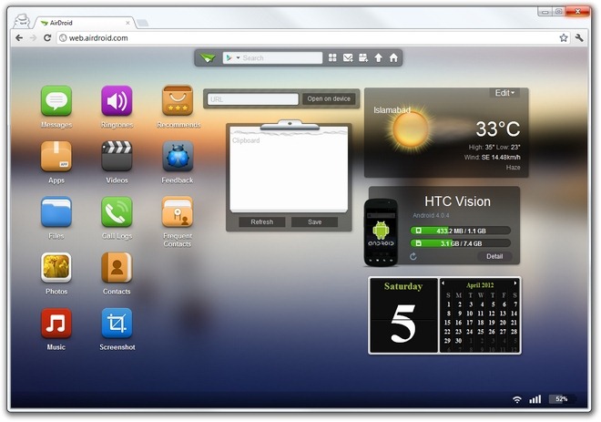 Migliorata la gestione degli appunti ed integrata la funzione con la quale possiamo condividere un url e visualizzarlo direttamente dal browser Android. Con il nuovo AirDroid possiamo anche visualizzare i desktop multipli ed aggiungere / visualizzare alcuni widget come calendario, meteo, ecc.