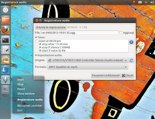 Il nuovo Audio Recorder migliora il supporto con GTK+3 ed il nuovo Ubuntu 12.04, integrando e migliorando la quicklist dedicata che ci permette di accedere ad alcune funzionalità dell’applicazione direttamente dal launcher. Audio Recorder 0.9 inoltre, aggiunge il supporto per MPRIS2 ed il nuovo indicatore nel pannello ci permette di poter utilizzare al meglio l’applicazione anche su Gnome Shell e Cinnamon, inoltre migliora il supporto con VLC.