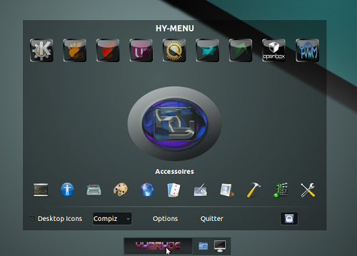 Hy-menu è un tool che permette di caricare il window manager e le applicazioni dedicate dell’ambiente desktop scelto, possiamo inoltre indicare quale tema, set d’icone utilizzare. Il tool Hy-menu permette di scegliere quale window manager tra Metacity, Compiz, Kwin e Mutter e altre opzioni avanzate.