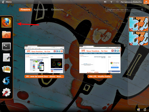 Se per esempio abbiamo più finestre avviate di Firefox assieme ad altre finestre avviate potremmo aver difficoltà nel riconoscerle, ci basterà portare il cursore sopra l’icona di Firefox nella dockbar per visualizzare solo le finestre attive di Firefox come da immagine in alto.
