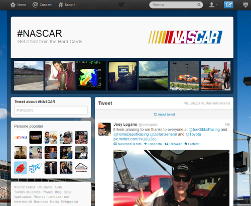 Per esempio nella nuova hashtag page #NASCAR potremo leggere e rimanere aggiornati con tutti i tweet dedicati alla Nascar con immagini, video, ecc.