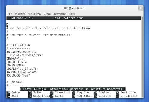 rc.conf è un file che contiene tutte le informazioni di configurazione per il sistema di base il quale ci permette di impostare l’ora, data e fuso orario, la mappatura della tastiera, i moduli del kernel che sono stati caricati manualmente, l’utilizzo di tecnologie di storage quali RAID, LVM, BTRFS, il nome della configurazione dell’host, configurazione del nostro ip locale o DHCP e i demoni del sistema.