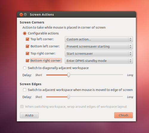 Se non vogliamo utilizzare le scorciatoie da tastiera per accedere ad alcune funzionalità di Compiz oppure per velocizzare l’avvio di un’applicazione ecc possiamo utilizzare l’Hot Corner attraverso una semplice applicazione denominata Brightside.