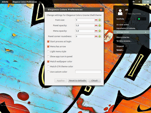 Il nuovo tool di Elegance Colors ci permetterà di modificare la dimensione del carattere del tema, l’opacità del pannello e del menu, le rotondità degli angoli del pannello, arrivare o disattivare le frecce nel menu e lo stile del menu in chiaro o scuro. Inoltre potremo per abbinare il colore del tema GTK al colore preferito del tema in Gnome Shell, indicare il colore per lo sfondo o utilizzare un colore personalizzato.
