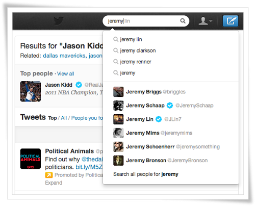 La nuova barra di ricerca in Twitter ci permetterà di effettuare ricerche per similitudini ad esempio se vogliamo cercare un nome simile o il nome vero di un’utente ci permetterà di conoscere i tweet che citano il vero nome di quella persona e il loro nome reale dell’account Twitter.