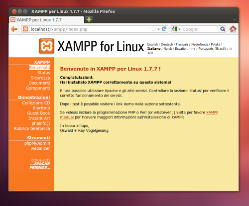 Particolarità di XAMPP è la sua semplicità, non richiede alcuna installazione nella nostra distribuzione (tranne il pacchetto python-glade2 per avviare XAMPP Control Panel) basta un semplice click quindi per avviarlo.
