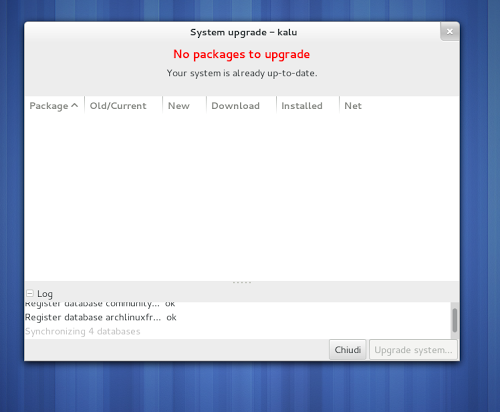 Per l’aggiornamento Kalu una finestra la quale ci permette di avere informazioni sullo stato dell’aggiornamento, dal download dei pacchetti all’installazione alla segnalazione di eventuali problemi.