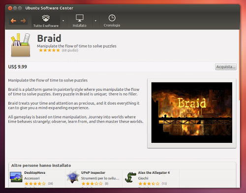 A quanto pare sono i giochi ad essere i preferiti dagli utenti Ubuntu, Braid è il gioco a pagamenti più scaricato dagli utenti mentre per la classifica delle applicazioni free troviamo al primo posto Command & Conquer Tiberium Alliances.
