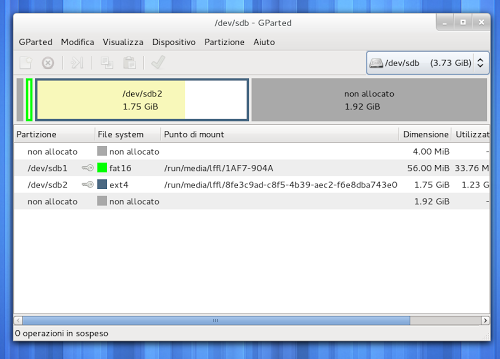 Raspian richiede una SD da 2Gb o superiore, una volta caricato il file immagine troveremo nella SD una partizione di boot in fat16 oppure fat32 e la partizione di root da 1.75 Gb. Se la nostra SD è superiore a 2GB (nel mio caso 4GB) possiamo aumentare lo spazio della partizione di Root in modo da completare lo spazio disponibile nella nostra SD il tutto senza perdere alcun dato grazie a Gparted.