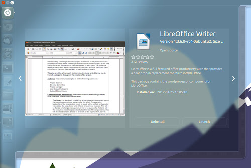 Grazie alle API dedicate gli sviluppatori potranno integrare la funzionalità anche nei vari Lens, ad esempio con il lens di ricerca su Wikipedia potremo avere l’anteprima della pagina web dal Dash senza quindi aspettare l’apertura del browser alla pagina indicata, tutto questo oltre ad essere più veloce richiederà anche meno risorse del sistema. Le anteprime potranno anche interagire con le applicazione come possiamo vedere dall’immagine in basso possiamo installare nuova applicazioni direttamente dall’anteprima senza dover accedere ad Ubuntu Software Center.