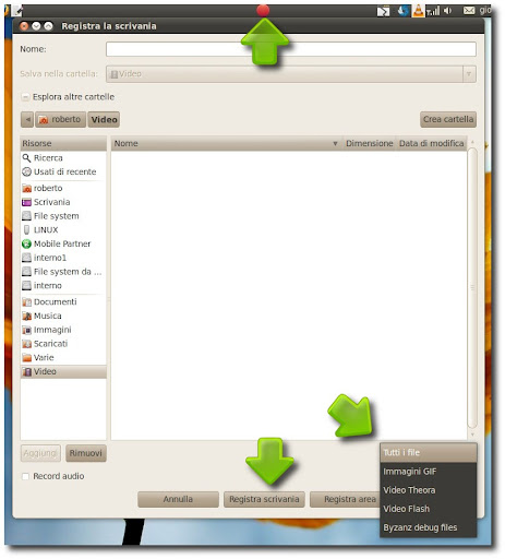 L’applicazione supporta Gnome 2 / Gnome Fallbask offrendo un comodo collegamento nel pannello dal quale possiamo avviare o terminare la registrazione cliccando sul pallino rosso. Al primo click ci verrà indicato se vogliamo registrare l’intero desktop o solo una parte di esso, il nome da dare al file e la cartella di destinazione oltre ad indicare il formato del video.