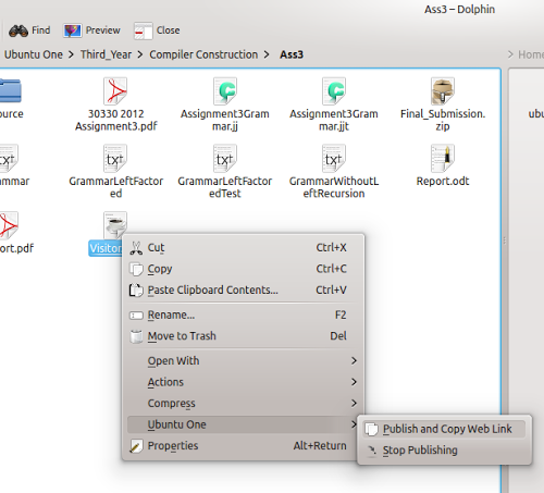 Potremo condividere i file presenti su Ubuntu One con i nostri amici semplicemente cliccando su di essi e avviando la condivisione. Avremo il link del file caricato automaticamente nei nostri appunti (clipboard), inoltre allo stesso modo potremo anche terminare la condivisione. Utile anche la possibilità di sincronizzare una cartella in Ubuntu One (o terminare la sincronizzazione) sempre dal menu contestuale di Dolphin.