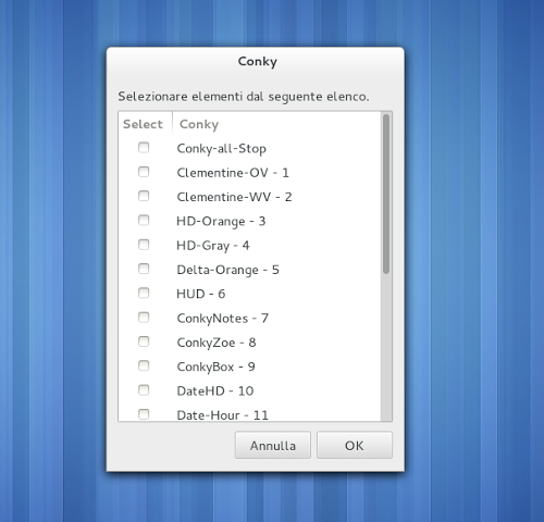 Una volta installati i 2 pacchetti basta avviare Conky Control dal nostro menu e scegliere il tema Conky preferito.