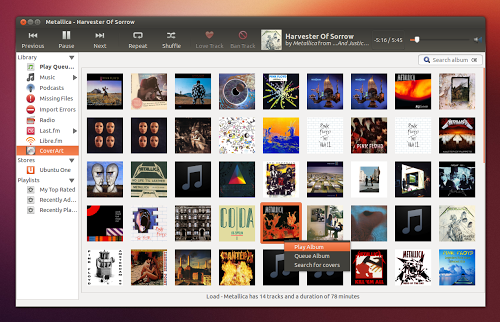 CoverArt Browser è un semplice plugin per Rhythmbox che permette di visualizzare e la ricerca attraverso le cover degli album. Una volta trovato l’album possiamo riprodurlo per intero o effettuare ricerche all’interno di esso oppure cercare una nuova cover il tutto dal menu contestuale.
